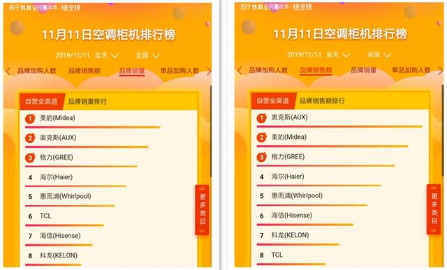 当天,自营全渠道家用空调销量前三名是美的、格力和奥克斯;销售额前三也是美的、格力和奥克斯。