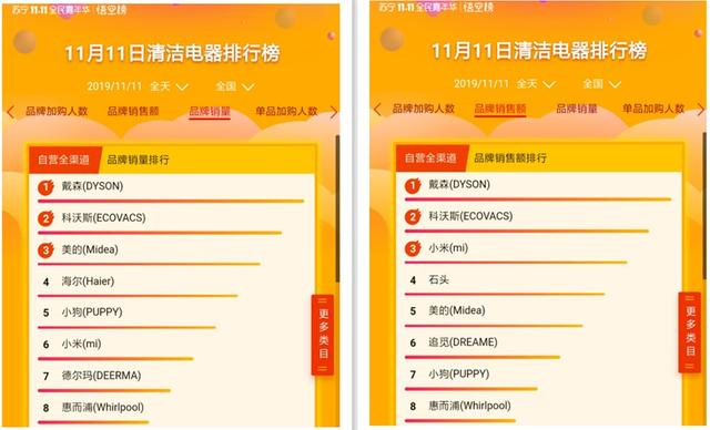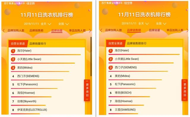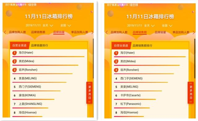 冰箱榜单中西门子与美菱分列四、五位。双十一当天,苏宁悟空榜冰箱销量前五位的则是:海尔、美的、容声、西门子和美菱。
