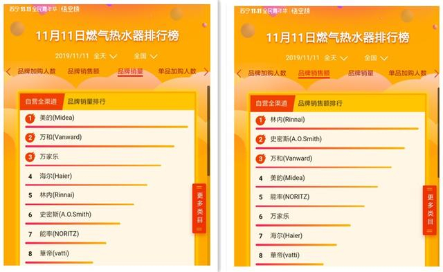 美的热水器销量第一,万和、万家乐、海尔和林内,销量位列二到五位;在销售额方面,林内、史密斯、万和、美的、能率分别位居一到五位。