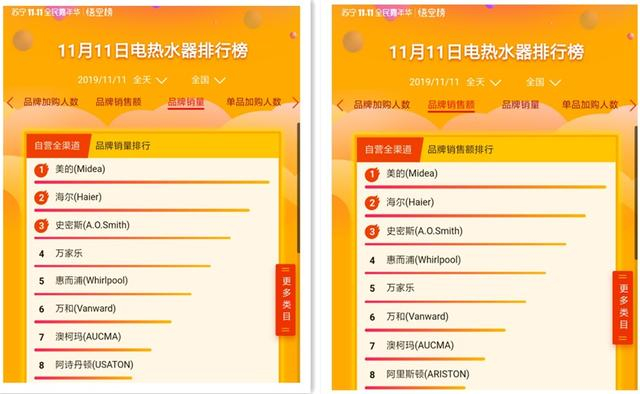 通过上述榜单发现,双十一当天,在苏宁渠道上美的成了最大的赢家。悉数每个榜单中,美的均榜上有名。从而也印证了美的作为综合家电、世界500强企业的实力。