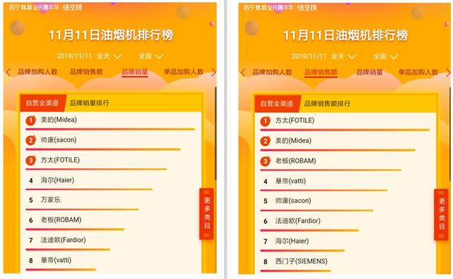 油烟机市场已不再是老板、方太、华帝、帅康四家独大,取而代之的是美的油烟机迅速飙升,大有取代方太、老板之势。双十一当天,美的油烟机销量排名第一,销售额排名第二;方太销量排名第三,销售额排名第一;而老板销量位居第六位,销售额位居第三;反而是过去两年稍显沉寂的帅康起势。双十一当天,帅康销量第二,销售额排名第五,均对老板实现双超。