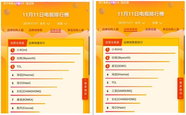电视行业的头部品牌依旧是海信、TCL、创维等厂商,但是互联网电视小米今年成为了大黑马。双十一当天,小米销量与销售额同列第一。