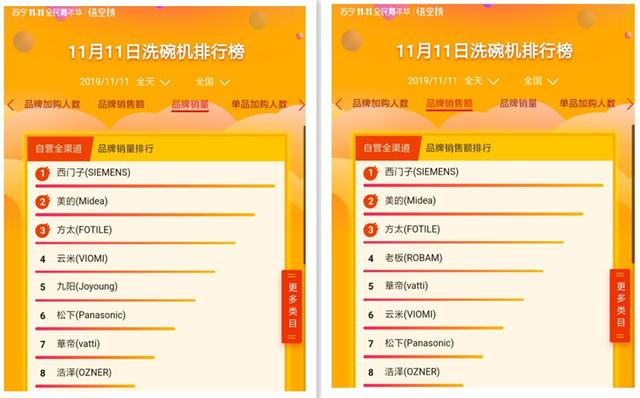 洗碗机成了新厨房主义的必需品。从苏宁双十一当天洗碗机榜单中可以看到,西门子、美的、方太稳居前三,地位不可撼动,而四到七位在销量与销售额上却变化较大。