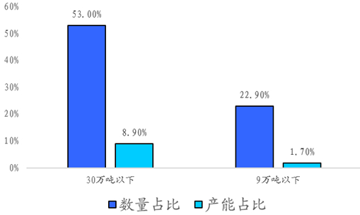 2、尤其是9万吨以下的小煤矿还有1344处,数量占比22.9%,产能占比1.7%。