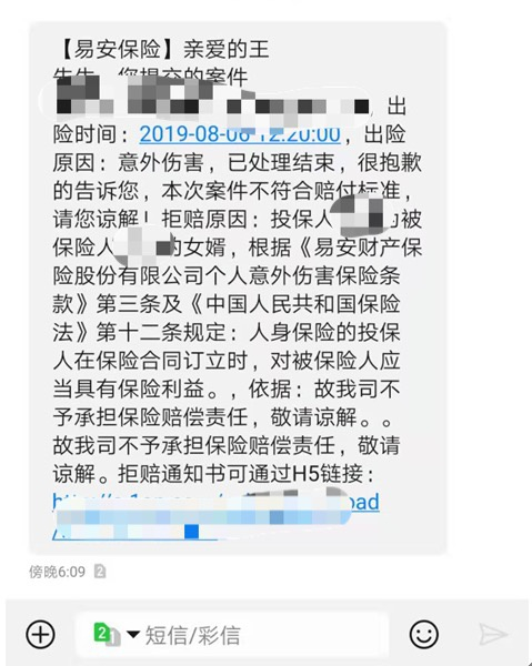 《华夏时报》记者看到,王先生提供的拒赔短信上显示的拒赔原因是,投保人为被保险人的女婿,根据《易安财产保险股份有限公司个人意外伤害保险条款》第三条及《中国人民共和国保险法》第十二条规定:人身保险的投保人在保险合同订立时,对被保险人应当具有保险利益。故我司不予承担保险赔偿责任。