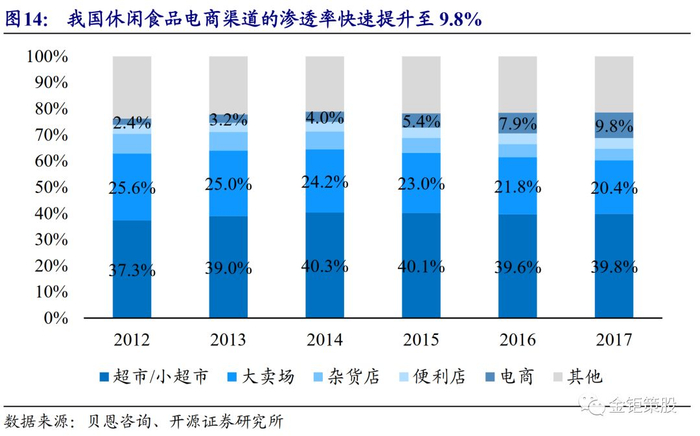 休闲零食消费的即时性、体验性决定了线下渠道为主,“宅文化”下电商渠道快速发展但亦有瓶颈,线上线下的融合发展是未来方向。休闲零食的消费非必须,计划性不强,更多为即时性消费,对产品的体验性要求高,消费场景以线下为主,线下渠道的占比达90%。不过随着国内电商的快速发展以及单价高可囤货的坚果类零食在电商渠道的火爆,休闲零食电商渠道的渗透率持续提升,诞生了三只松鼠、百草味等电商渠道的品牌。电商渠道具备方便、快捷的优势,符合现代年轻人“宅文化”的消费习惯,据贝恩咨询的统计数据,2017年休闲零食行业电商渠道的占比已经快速提升到了9.8%。但电商渠道同样存在缺乏即时体验性,并且由于快递成本的存在,需要高客单价覆盖物流成本,适用于高单价可囤货的休闲零食品种。在电商渠道红利消退,线上引流成本逐步提升的背景下,休闲零食线上渠道的增速也开始放缓。线下渠道具备良好的即使体验性,但实现跨区域销售难度大(尤其是采用连锁门店经营模式),线下品牌商大多为区域性品牌。线上平台可以帮助企业了解消费者的购物习惯,并且形成的品牌效应为全国化的品牌效应,可以帮助线下实现跨区域的销售。因此整合线上的数字化和品牌资源以及线下的即时性体验,对于未来的消费者而言至关重要,线上线下融合发展的“新零售”模式是未来休闲零食的发展方向。电商渠道的龙头三只松鼠在2016年开设首家线下门店之后,持续开拓线下渠道,截止2019年中已经开设了73家松鼠投食店和78家联盟小店,2019H1公司线下渠道收入2.73亿,占收入比例达到6.06%。华东线下休闲零食龙头来伊份近年来则是发力电商渠道,2019H1公司电商渠道收入达到2.2亿,占收入比重达到10.8%。华中地区的龙头良品铺子则是更早发力电商渠道,2018H1来看电商和线下渠道的占比分别为44.5%和55.5%。