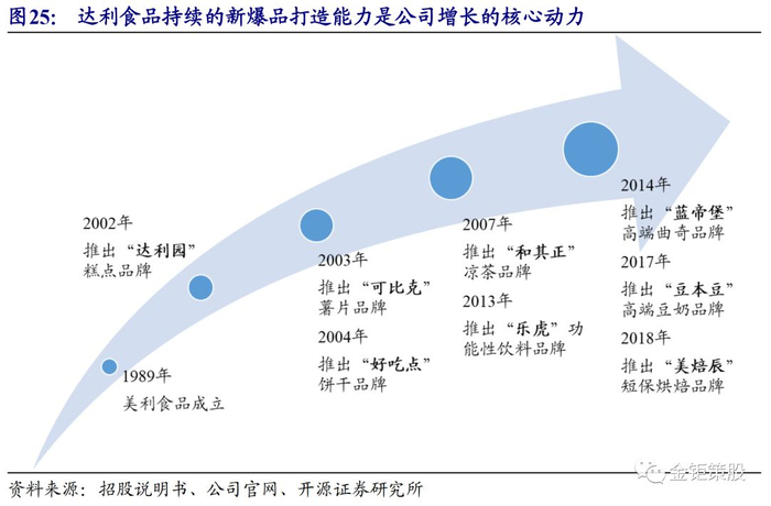 全产业链布局,快速跟进,持续的爆品打造能力。多品类、多品牌战略的典型为达利食品,持续的新的爆品打造能力是公司成为业内领先者的关键。公司于1989年在福建成立,开始生产饼干产品,1992年推出了首款“达利”品牌的饼干产品,1997年,“达利”品牌食品被列为中国公认名牌产品。2002年公司继续推出“达利园”品牌的糕点类产品,并获得中国食品工业协会评价为“全国食品工业优秀龙头食品企业”。2003-2004年公司相继推出“可比克”品牌的薯片产品和“好吃点”品牌的饼干产品,并且将销售渠道拓展到了全国。2007年公司推出“和其正”品牌的凉茶产品正式进军饮料市场,2013年再次推出“乐虎”品牌的功能性饮料,在全国16个省市建立了子公司。2014年公司推出了“蓝帝堡”品牌的高端曲奇产品,2017年推出了“豆本豆”品牌的高端豆奶产品,2018年推出了“美焙辰”品牌的短保烘焙产品。可以看到,公司持续的爆款产品打造能力驱动了公司长期持续的增长,并且每个新打造的品类和品牌在相关领域都有较高的知名度和市场影响力。其中“达利园”是长保烘焙领域的龙头品牌,“可比克”位居国内薯片品牌排名前五,“好吃点”是国内饼干领域的知名品牌,“和其正”在凉茶领域排名仅在“王老吉”和“加多宝”之后,“乐虎”在功能性饮料中更是仅位于“红牛”之后,“豆本豆”、“蓝帝堡”、“美焙辰”也都建立起了市场的知名度。同时公司也建立起了覆盖全国的销售网络,拥有超过5228个经销商,建立了从省市到县、城镇和乡村市场的深度分销网络,在全国拥有16个战略性布局的工厂,方便降低物流成本的同时实现快速铺货。紧跟消费潮流变化,专注于高增长的产品品类,强大的产品创新实力、全产业链的布局、快速跟进市场,是公司持续打造爆款新产品的保障。目前公司已经建立起了全国化的深度分销网络,针对有市场潜力的快速成长品类,公司已经形成了快速产品研发、品牌宣传、渠道铺货打造爆品的核心竞争力,成为了休闲食品领域多品类、多品牌的集团型公司。