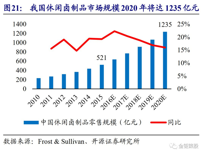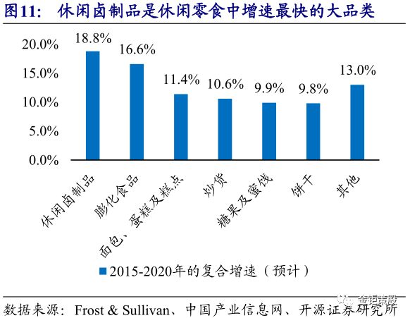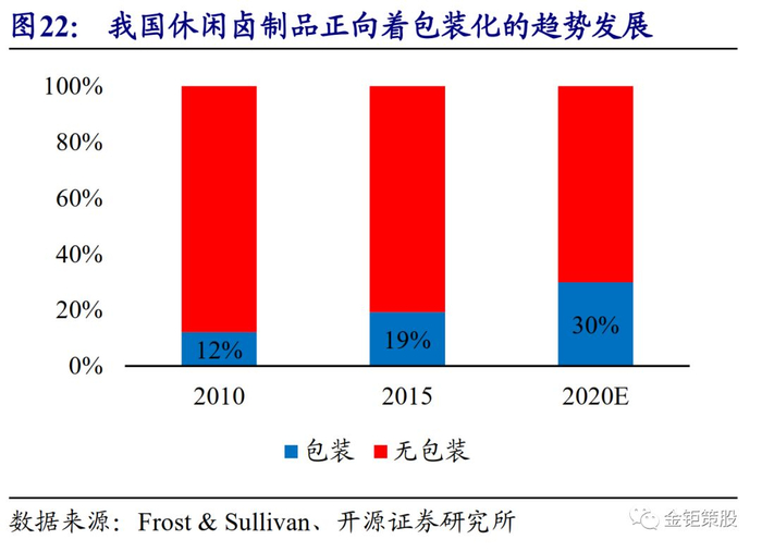 本土特色休闲零食,品牌化和包装化大势所趋。休闲卤制品作为本土特色的休闲零食,辣味上瘾的特性促使其成为了休闲零食中复合增速最快的子领域。同时,随着真空及MAP包装技术和冷链物流的进步,使得休闲卤制品可以实现集中的标准化统一生产然后分销到各销售网点,从而催生出了休闲卤制品线下品牌连锁门店这一业态。消费升级的背景下,消费者卫生意识的提升,以及线下连锁门店模式的快速发展,推动了休闲卤制品行业向着包装化和品牌化的方向发展。据Frost & Sullivan预计,我国包装休闲卤制品和品牌休闲卤制品在2015-2020年的复合增速将达到30%和28.9%,占比将持续提升。