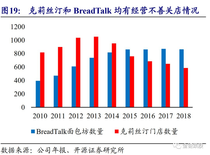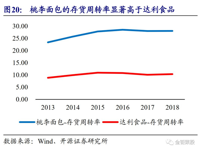 短保烘焙“中央工厂+批发”模式更优,渠道高周转是王道,核心在于线下渠道布局和供应链保障能力。短保烘焙产品一般存在连锁面包坊和“中央工厂+批发”两种模式。连锁面包坊消费体验更佳,但由于门店租金和人工成本的持续上涨,同时国内面包单价和消费频次相对较低,坪效和ROE相对较低,对加盟商吸引力不足,更多通过品牌直营店的模式扩张。目前国内面包等烘焙产品仍旧处于量增为主的发展阶段,性价比是消费者更加关注的因素,更加注重品质和体验的品牌直营门店模式在快速扩张之后也已面临经营压力。以克莉丝汀和BreadTalk为例,克莉丝汀早在2012年收入达到巅峰的13.91亿元后就开始持续下滑,2018年收入仅6.65亿元,不到巅峰时期的一半。BreadTalk烘焙产品收入同样在2015年达到顶峰的3.08亿美元之后持续下滑,2018年收入为2.82亿美元。伴随着收入下滑的同时是门店经营压力增大,亏损甚至关店,克莉丝汀门店数量已经由2013年底巅峰的1052家减少了到2018年底的586家,BreadTalk近年来也开始关闭部分经营不善的门店,2018年底面包坊数量为863家,较2017年底减少了8家。另一方面,以桃李面包为代表的更注重产品性价比的“中央工厂+批发”模式则保持了持续快速的发展,持续抢占面包坊的市场份额。短保烘焙产品“中央工厂+批发”模式下对供应链的要求极高。短保产品保质期在15天以内,在这一段时间内要实现从中央工厂生产到配送至各站点,然后以各站点为中心辐射运送到当地的便利店和KA门店,便利店和KA门店快速上架销售,消费者到店购买消费,同时门店将销售情况和订单反馈到中央工厂这一全过程。并且为了保证产品的新鲜度以及早餐的消费需求,一般从中央工厂生产到门店上架需要在几小时内完成,而且一般需要在早上就完成渠道的送货和产品上架。短中保产品的生产成本与长保产品差异不大,主要的差异在于快速周转的物流成本以及产品的报损成本。高的周转率说明产品动销快,品牌力和复购率的提升,报损费用的下降则会大幅提升盈利能力。高的渠道周转率需要高质量的供应链能力来保障,以实现既不缺货又不过期,保障销售的同时提升净利率。短保产品对线下门店终端的要求高,且线下渠道布局完善后才能形成较好的品牌集聚效应,加快动销。因此,实现渠道高周转的核心在于完善的线下渠道布局和供应链的保障能力,可以看到短保龙头桃李面包的存货周转率是长保龙头达利食品的近三倍。