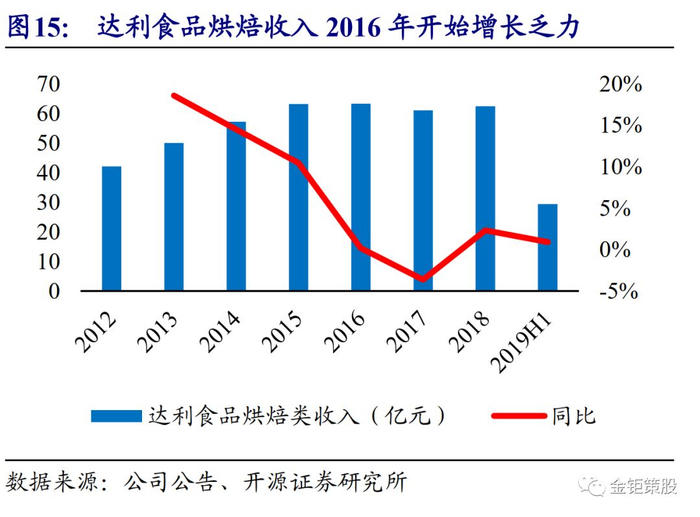 烘焙是休闲零食第一大品类,健康化驱动消费由长保向短中保升级。烘焙类产品按照保质期可以分为短中长保产品,其中长保国产品牌包括达利园、盼盼等,中保国产品牌包括港荣、豪士、憨豆先生等,短保国产品牌则包括了桃李、美焙辰(达利旗下)等。烘焙类产品为了延长保质期需要添加防腐剂等食品添加剂,牺牲了一定的产品品质和口感,同时新鲜度和健康程度要差。短保(15天以内)和中保(15-60天)产品保质期大幅短于长保产品(180天),但新鲜度、口感和健康程度显著好于长保产品。短保和中保产品要求供应链周转速度快,在保质期内不能成功销售的产品将会退回报损,产品成本显著高于长保产品。在休闲零食健康化的消费升级趋势下,烘焙类产品目前正由长保产品向短中保产品升级。国内长保烘焙的龙头达利食品烘焙糕点类收入从2016年开始进入增长瓶颈,2017年甚至开始出现下滑(同比-3.6%)。而国内短保面包的龙头桃李则持续保持着20%左右的收入复合增速。达利食品在2018年11月也同样推出了新品牌美焙辰切入短保市场,在几个月内即开拓了3万多个销售终端,驱动公司烘焙糕点类产品重回增长。中保产品中港荣、豪士、盐津铺子等近年来同样取得了快速的发展。