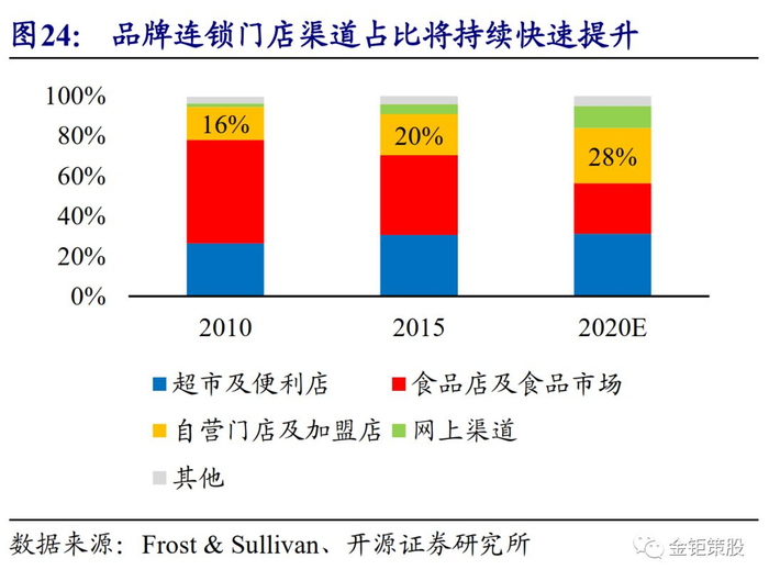 本土特色休闲零食,连锁门店模式驱动行业品牌化集中。休闲卤制品是中国本土特色的休闲零食,由卤味餐桌食品演化而来,在中国烹饪历史上已经有超过两千年的历史。据Frost & Sullivan的统计数据,我国休闲卤制品行业规模在2015年已达521亿元,预计在2020年将达到1235亿元,2015-2020年的复合增速为18.8%,是所有品类中复合增速最快的品类。随着包装技术的进步和卫生意识的不断增强,特别是MAP(气调保鲜技术)技术可以在不经过超高温处理的条件下延长产品的保质期,保证了产品的新鲜度和口感,使得休闲卤制品正在由无包装向包装化发展。据Frost & Sullivan预计,我国包装卤制品的市场规模将由2015年的100亿元增长到2020年的370亿元,复合增速达到30%,占比也将由2015年的19%提升到2020年的30%。从销售渠道看,我国休闲卤制品目前主要在超市、便利店、食品店和食品市场等传统的线下渠道销售,渠道占比超过70%,而在品牌连锁的自营门店及加盟店销售的占比仅20.5%。在消费升级的背景下,品牌知名度已经成为影响消费者购物的决定性因素之一,品牌休闲卤制品也意味着质量和卫生标准更高。未来品牌化的趋势势不可挡。Frost & Sullivan预计品牌休闲卤制品的市场规模将由2015年的241亿元增长到2020年的855亿元,复合增速达到28.9%,占比也将由2015年的46%提升到2020年的69%。目前行业主要龙头品牌绝味、周黑鸭、紫燕、煌上煌、久久丫均采用品牌连锁自营或加盟门店的形式进行销售。品牌连锁门店模式能够有效地保障产品和服务质量,并且休闲卤制品对于门店面积要求低,产品单价和消费频次较高,门店坪效和ROE都较高,能够吸引加盟商快速复制全国化扩张。目前龙头绝味食品在全国已有10598家门店。Frost & Sullivan预计休闲卤制品自营门店和加盟店渠道销售的占比也将由2015年的20%提升到2020年的28%。消费升级背景下,品牌连锁门店模式驱动了行业的品牌化集中,未来将不断抢占传统超市、便利店、食品店和食品市场的份额。