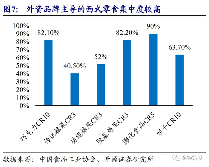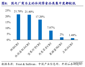 品种众多、进入门槛低,整体行业分散,其中标准化程度较高的西式零食品类被外资垄断相对集中,其他国内厂商主导的品类集中度都较低。我国地域辽阔,各地域由于气候、饮食习惯、消化等方面的差异,形成了不同的口味偏好,如“南甜北咸”、“东辣西酸”等。口味偏好的差异、食材的多样化、西式零食的进入,以及休闲零食本身满足人类需求和消费场景的多样化,造就了休闲零食行业品类和品种的多样化。我国的休闲零食,尤其是本土化的传统零食,生产工艺大多来自传统的手工制作,很多没有统一的工艺标准,产品品质和口味差异也较大,标准化程度较低。同时,休闲零食行业的进入门槛很低,爆款产品出来之后很容易被后来者快速跟进模仿,产品同质化现象严重。以近年来爆红的每日坚果和手撕面包为例,沃隆在2015年4月推出按人体每日营养需求配比的坚果组合“每日坚果”后,三只松鼠、百草味、良品铺子、洽洽食品、来伊份、新农哥、中粮、姚生记等数十家企业也相继推出了每日坚果产品;同样目前市场上手撕面包的品牌也已有包括三只松鼠、盼盼、良品铺子、百草味、桃李、乐锦记、来伊份、葡记等数十家。品种众多、标准化程度较低,叠加行业门槛低,带来了整体行业竞争格局的分散。不过分品类来看,对于标准化程度较高的西式零食,如糖果、巧克力、薯片和饼干等,由外资品牌主导,市场集中度较高。巧克力市场上,2016年我国巧克力销售额的CR10为82.1%,其中前两名玛氏(旗下主要品牌为德芙)和费列罗分别占比39.8%和17.8%,市场集中度较高。糖果市场中传统糖果阿尔卑斯、雅客和大白兔占据市场份额分别为的15%、13%和12.5%,CR3为40.5%;功能性糖果雅客、荷氏和金嗓分别占22.5%、18.3%和11.2%,CR3为52%;胶基糖果中绿箭、益达和乐天分别占49.9%、22.6%和9.7%,CR3达到了82.2%。膨化食品市场上(主要为薯片),乐事、上好佳、好丽友、品客、可比克、艾比利等品牌占据了零售渠道90%以上的市场份额,其中,乐事以超过25%的市场份额稳居第一。饼干市场上,CR10为63.7%,其中前两名分别为乐滋中国和徐福记,分别占据14.4%和8.9%的市场份额。而对于标准化程度相对较低的烘焙类(根据保质期可分为短中长保产品,存在众多的小型面包糕点店),本土化的休闲卤制品、坚果炒货以及规模较小的小品类休闲零食而言,国内厂商占据主导,市场也更为分散。2016年我国烘焙食品市场CR5为21.7%,其中达利食品、桃李面包和嘉顿市场份额为前三,分别占比7%、6.6%和3.4%。休闲卤制品的CR5为21.4%,前五名分别为绝味、周黑鸭、紫燕、煌上煌和久久丫,市占率分别为7.4%、6.8%、3.4%、2.4%和1.4%。坚果炒货的CR5为17.2%,前五名分别为恰恰、三只松鼠、百草味、良品铺子和来伊份。小品类休闲零食的市场集中度则更低,果脯蜜饯前五大品牌分别为溜溜果园、怡达、御食园、佳宝和华味亨,CR5仅2.08%;肉类零食的前五大品牌为有友、五洲、棒棒娃、母亲、品品,CR5为7.87%;豆制品的前五大品牌为奇爽、盐津铺子、口口香、华鹏、吴府记,CR5为1.48%。