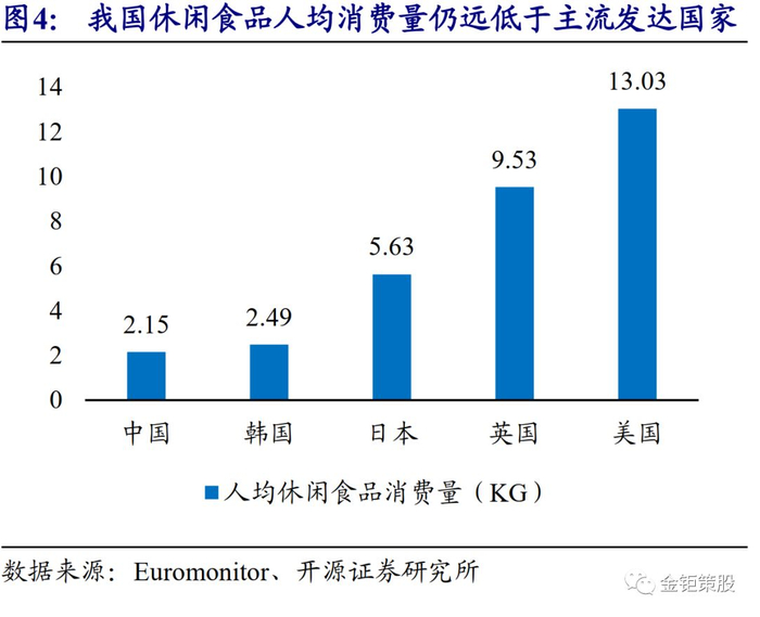 休闲零食是人们在主食之外,在闲暇、休息时吃的食品,品种多样,大致上可以分为谷物类休闲食品(烘焙、膨化类、油炸类)、糖果巧克力、坚果炒货、休闲豆制品、休闲素食蔬菜果、肉干肉脯、果冻、果脯蜜饯、西式甜点等。休闲零食指代的是一类正餐以外、充饥性需求较弱、强调消费场景、满足多维度需求(包括健康化,更多功能延伸,融入更多情绪价值等)、单品或者多品创意融合、可散售的即食类食品。需求的多样化、消费场景的多样化也就决定了休闲零食行业产品和品类的多样化,华中地区龙头良品铺子的产品组合已经超过了1000种,华东地区龙头来伊份的SKU超过了800个,即使产品品类相对较少的线上龙头三只松鼠的产品组合也超过了500款。休闲零食由于界定边界的差异,行业规模存在多个统计口径,但均显示目前我国休闲零食市场规模已破万亿。据中商产业研究院推算,休闲零食市场包含一切“少量方便包装食品”,市场规模在2017年已超9000亿,增速保持在11-12%左右,预计目前市场规模已超万亿。据中国食品工业协会《中国休闲食品行业发展研究报告》,我国休闲食品行业年产值从2005年的2552亿元增长到了2014年的10620亿元,年复合增速17.17%,预计到2020年行业市场规模将接近2万亿。据Frost & Sullivan的统计数据,2018年我国休闲食品行业市场规模为10297亿元,2012-2018年的CAGR为12.26%。虽然我国休闲零食销量巨大,但人均消费仍远低于主流发达国家,仍有较大的成长空间。据Euromonitor统计数据,2015年我国休闲零食人均消费量为2.15KG,韩国和日本分别为2.49KG与5.63KG,英国、美国则分别为9.53KG与13.03KG。我国人均休闲零食的消费量与韩国接近,但较日本还有翻倍以上的提升空间,较英国和美国则分别还有3-5倍的成长空间。同时在消费升级的背景下,消费者对于休闲零食的要求也越来越高,我国休闲食品正逐步向健康化、高端化升级,休闲零食行业整体价格也随之稳定提升。量价齐升,我们认为中国休闲零食行业仍将继续保持稳健较快增长。