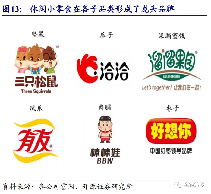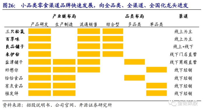 渠道端出发,打造全品类休闲零食平台:小品类休闲零食市场极度分散,更适合零售品牌商从渠道端出发整合形成综合性的零食平台。目前已经形成了单品类、单渠道或者区域性的龙头品牌,未来均向着多品类、全渠道、全国化的龙头迈进。