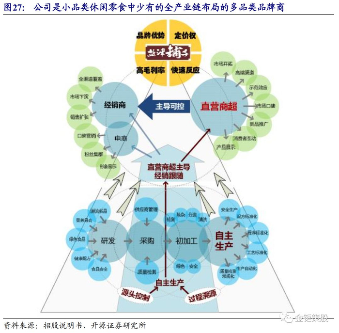 公司是小品类休闲零食中唯一一家全产业链布局的多品牌、多品类的品牌商。小品类休闲零食的多品类品牌商大多是仅在渠道布局的零售品牌商,公司是唯一一家的完成了从新品研发、生产到销售全产业布局的多品牌、多品类的品牌商。针对休闲食品行业快速消费、品种更新换代快的特征,公司开发了“实验工厂”模式来进行新产品的开发。在“实验工厂”模式下,应对市场的新需求,公司可以快速启动新品开发,短期内完成小批量生产后投放市场,市场反应良好的产品即开始大规模的生产和推广。公司的全产业链布局使得“实验工厂”模式可以实现新品研发到生产销售的无缝对接,能够针对市场的变化快速反应,在第一时间满足消费者的需求。