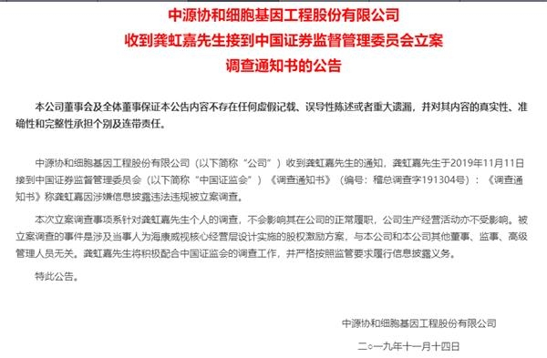 接着,中源协和也发了一条公告。中源协和在公告中称,本次立案调查事项系针对龚虹嘉先生个人的调查,不会影响其在公司的正常履职,公司生产经营活动亦不受影响。被立案调查的事件是涉及当事人为海康威视核心经营层设计实施的股权激励方案,与本公司和本公司其他董事、监事、高级管理人员无关。