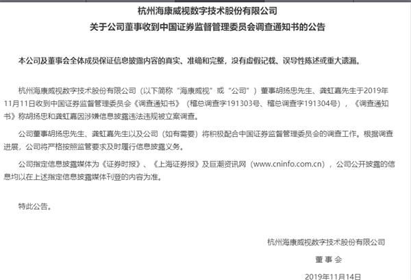 13日下午,海康威视突发公告称,公司董事胡扬忠先生、龚虹嘉先生于2019年11月11日收到中国证券监督管理委员会《调查通知书》(稽总调查字191303号、稽总调查字191304号),《调查通知书》称胡扬忠和龚虹嘉因涉嫌信息披露违法违规被立案调查。