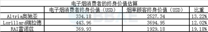 根据现有信息,我们很难找到收购JUUL之后,电子烟为奥驰亚贡献了多少的收入与利润。这里我们使用“顾客终身价值”的概念,这是一种基于产品和品牌忠诚度来估算企业客户价值的粗略模型。选择Lorillard(瑞拉德)、RAI(雷诺兹)作为可比公司,基于一定的经济学假设,粗略的估算电子烟产业的价值大概占到奥驰亚烟草制品产业的13.22%,这个比重并不算大。