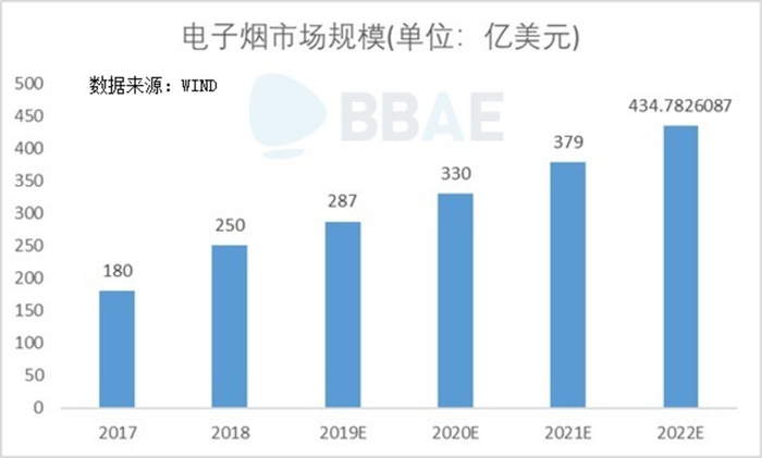 电子烟行业发展迅速,2017年全球电子烟市场规模接近180亿美元,2018年约250亿美元,预计到2022年规模超过400亿美元,超越烟丝、雪茄,成为仅次于卷烟的第二大类烟草制品。电子烟使用人数较2011年的700万上升至2018年的4000万,市场规模增长快速。