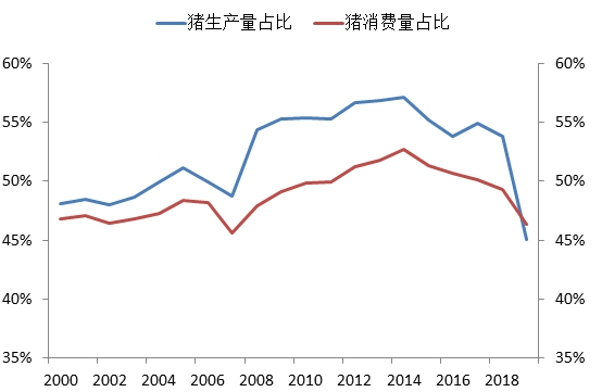 由于受猪瘟持续蔓延、环保要求提高和上一年存栏率下降等诸多因素影响,2019年我国的猪产量占全球的比重,从2018年的53.8%大幅下降至45%。估计到2020年,猪产量又将再度回升。