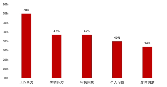 除了工作时间过长,休闲娱乐和睡眠时间就相应减少。此外工作压力过大导致的睡眠问题也成为普遍现象。根据第一财经商业数据中心公布的数据,中国互联网网民中有56%表示自己有睡眠问题。而工作压力大成为网民失眠的最大原因,其次为生活压力和环境因素。有四成职场人士经常需要加班且在0点以后入睡,超过25%的商务精英失眠的主要原因就是因为工作压力大。