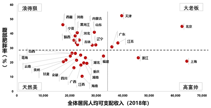 根据中国医学科学院近期对44万成年人的调查研究,将腹型肥胖率定义为“男性腰围≥90厘米,女性腰围≥85厘米”,结果表明我国有近三成的居民都是“大粗腰”。并且呈现出“北方多、南方少”、“西部多、东部少”的特点。 其中,天津、西藏、北京、山东、黑龙江、河南是“粗腰重灾区”,腹型肥胖率分别为52.3%、46.2%、45.0%、40.9%、40.5%和38.4%。如果把这个结果与31个省市区人均可支配收入叠加起来,会出现有意思的现象。