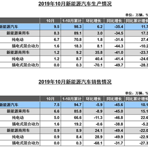 中汽协发布的新能源车产销数据显示,2019年10月新能源车产销量分别为9.5万辆、7.5万辆,同比下降35.4%和45.6%;10月新能源乘用车销售6.6万辆,其中,纯电动乘用车销售5万辆,环比下滑11.3%,插电式混合动力车销售1.6万辆,同比下降38.7%。