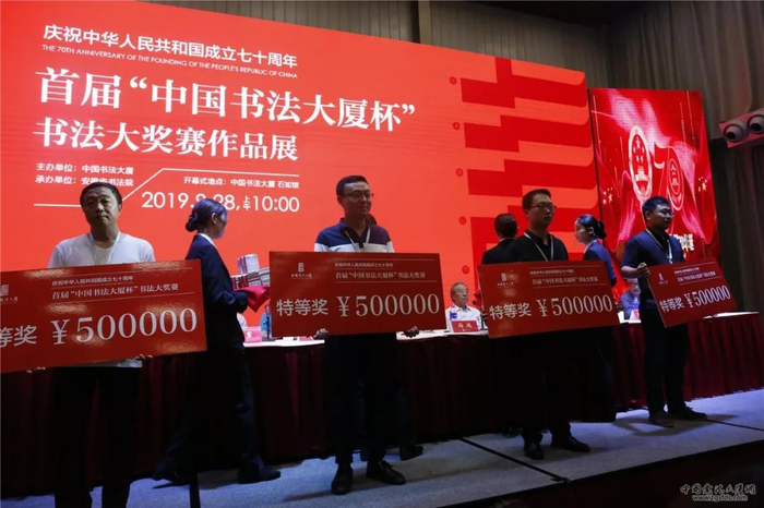 就在今年,中国书法大厦还冠名了一次书法比赛。据公开报道,这次大赛共收到海内外作品近两万件。9月28日,首届“中国书法大厦杯”书法大奖赛颁奖,给予5名特等奖获得者每人50万元现金奖励,共计发出数百万奖金。“书法界从来没有过这么高的奖金,一般一两万,五万都少见。”纪光明说。