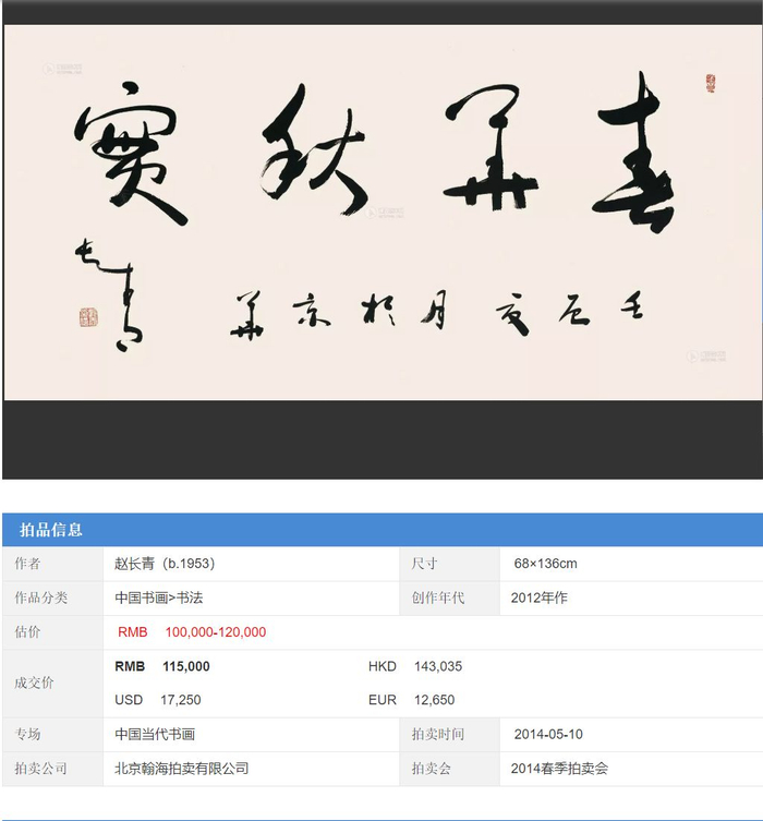 ▲国内某拍卖网站,赵长青作于2012年一幅字以11.5万元拍卖价成交。网络截图