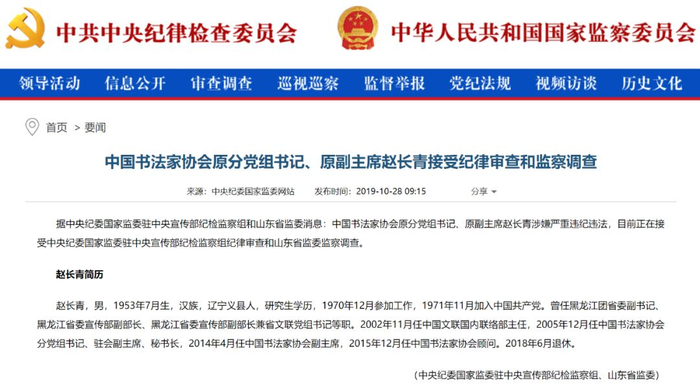 2019年10月28日,中央纪委国家监委网站发布消息,中国书法家协会(下称“中书协”)原分党组书记、原副主席赵长青涉嫌严重违纪违法,目前正在接受调查。