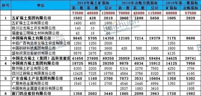 上周,工信部、自然资源部下达2019年度稀土开采总量控制指标。2019年度全国稀土开采、冶炼分离总量控制指标分别为132000吨、127000吨。全国钨精矿(三氧化钨含量65%)开采总量控制指标为105000吨,其中主采指标78150吨,综合利用指标26850吨。
