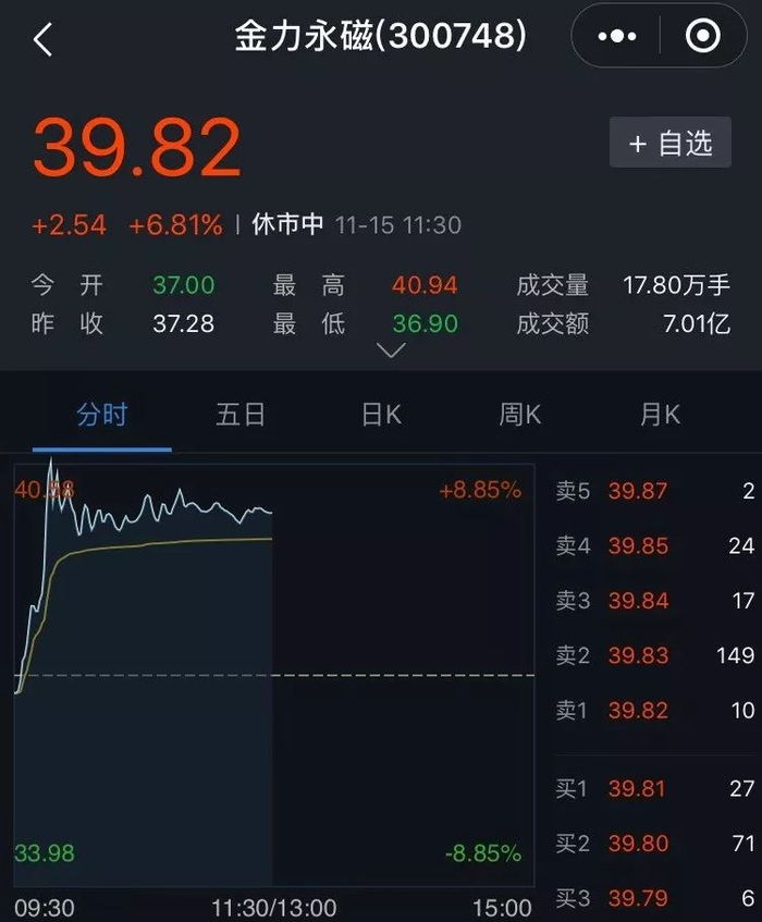 另一热门概念股金力永磁早盘则收涨6.81%,但盘中涨幅一度摸高至8.85%,上午成交额为7.01亿元,超过近8个交易日单日成交额。