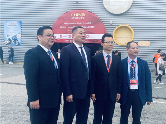 杭州市市委常委秘书长许明(左二)莅临2019年米兰奥特波兰展,充分肯定了展会对杭州企业走出去的实质帮助,并与潘建军(左一)合影