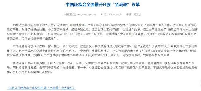 刚刚,证监会表示,经国务院批准,现全面推开H股“全流通”改革。符合条件的H股公司和拟申请H股首发上市的公司,可依法依规申请“全流通”。