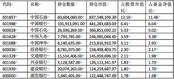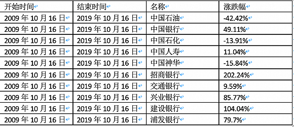 以上是上证综指2009年的前十名的重仓股,不难看出,中国石油占比12%,中国银行6.4%,中国石化5.33%,中国人寿3.59%,一只股票占到如此之大的权重,它的价格起伏势必对指数产生莫大的影响。那么,这些股票在去年十年的表现又是怎样的呢?