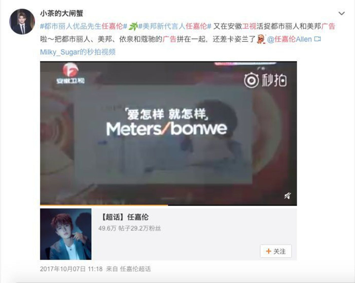 之后,任嘉伦代言的都市丽人、美特斯邦威、依泉三个品牌的广告也相继出现在了安徽卫视。不知,这三个广告代言是否为欢瑞如法炮制的结果。