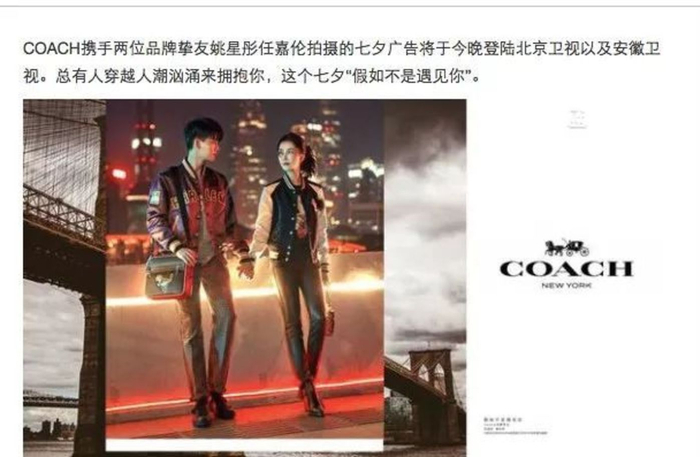 2017年8月,Coach公布了任嘉伦、姚星彤为其拍摄的七夕广告。