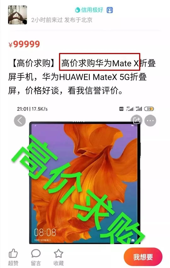 在闲鱼平台上,不少用户正在高价求购华为MateX可折叠屏,有的声称价格好谈,有的加价高达两万元。还有一位闲鱼用户称,“高价收华为Mate X折叠手机,价格高到你无法想象。”