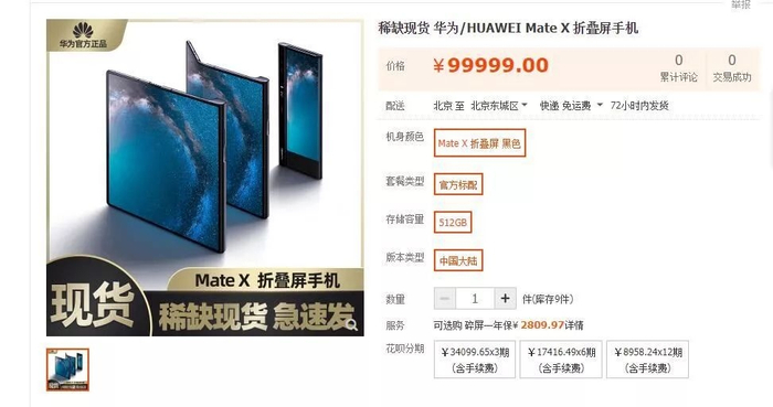 11月15日10时08分,华为首款可折叠屏5G手机Mate X在华为商城正式开售,全网通8GB+512GB(星际蓝)版售价16999元。
