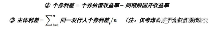微观视角下的个券利差和主体利差。计算个券利差是构建利差体系的第一步,计算方法如公式②所示。信用债的到期收益率通常被视作无风险利率与流动性溢价、风险溢价三者的叠加,以同期限国开收益率作为无风险利率,流动性溢价和风险溢价之和反映为个券利差。个券利差是信用债估值的常用标尺,但也存在局限性,主要体现在:(1)估值收益率可能滞后或失真;(2)私募债、含权债的个券利差与公募不含权信用债的个券利差并不能简单横向对比。也正是基于第二个原因,我们在计算主体利差的时候应当只考虑公募不含权信用债,计算方法如公式③所示。