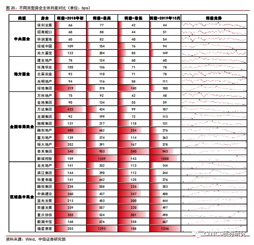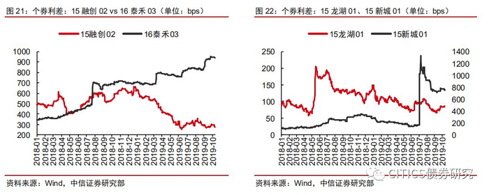 主体利差最常用的场景是可比公司对比。主体利差实际上是发行人债券估值的标尺,正如P/E、P/B等指标是股票估值的标尺。与分析股票的相对估值是否合理类似,分析债券发行人的主体利差是否被高估或低估主要也是通过在可比公司之间进行比较。我们以房地产行业为例,由于按照评级划分的房企利差指导意义不强,我们将房地产企业划分为中央国企、地方国企、全国布局民企、区域集中民企4类,并分别观察各类房企的主体利差走势。可以看到,截至2019年10月,国有房企的利差普遍较低,而民营房企的利差则相对较高,且分化明显,极值之间的差距非常大,与此相应的价值挖掘空间也比较大。