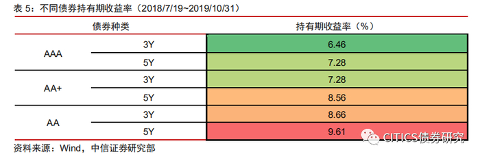 更进一步,信用利差还可以指导资质下沉的力度。在信用债内部进行资质决策时,同样可以借助不同评级的信用利差进行分析。例如,2018年前3季度,中低评级信用债的信用利差大幅走扩,AA+和AA评级信用利差分别上升86和121bps,处于而AAA评级信用利差则仅仅上升20bps,中低评级信用债的配置性价比开始凸显。假设在2018年7月19日买入不同评级信用债,并持有至2019年10月31日,则AA+和AA级信用债的持有期收益率均高于AAA级信用债。