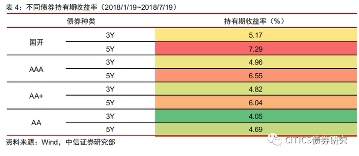 (2)2017年全年,10年期国开债收益率反弹112bps,而AAA、AA+和AA评级信用利差仅反别反弹13、18和11bps,随后在2018年利率持续下行,而信用利差则经历了一波明显的走扩。假设在2018年1月19日买入相同期限的国开债和各评级信用债,并在2018年7月19日卖出,则各评级信用债的持有期收益率均低于同期限国开债。