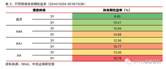 (1)2014年底,10年期国开债收益率处于2013年以来的低位,而各评级信用利差则处于历史高位,随后经历了持续近2年的信用利差收窄。假设在2014年12月24日买入相同期限的国开债和各评级信用债,并在2016年10月26日卖出,则各评级信用债的持有期收益率均高于同期限国开债。