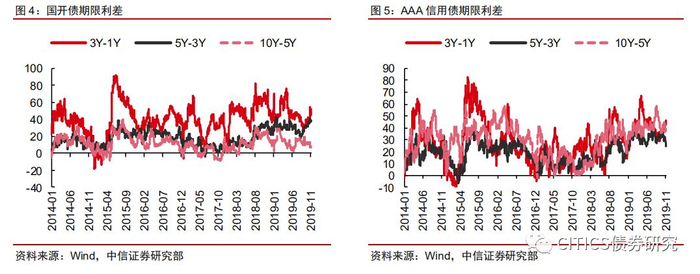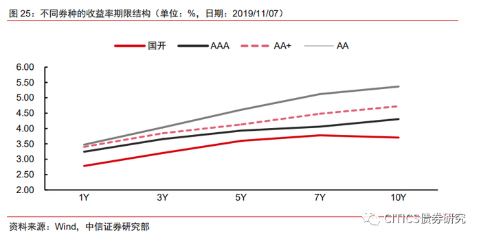 当然,如果研究目的是久期抉择,那么研究对象和基准分别是不同期限的同类债券。以个券为研究对象,以同期限国开债为基准,代表了信用领域利差构建的一般情况,主要反映不同发行人或发行人集合的信用风险,研究目的主要在于资质抉择。而在资质之外,信用债投资需要判断的另一个维度是久期,指导久期抉择的标尺之一为期限利差,而构建期限利差的研究对象和基准则分别是不同期限的同类债券。不仅信用债可以构建期限利差,利率债的期限利差实际上更加常用,因为期限结构对于利率债投资的指导意义大于信用债投资(信用债成交的估值偏离多于利率债)。
