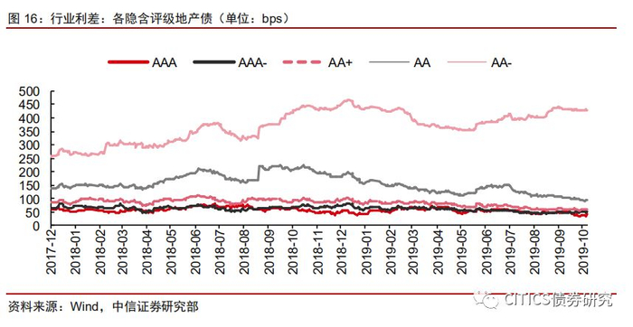 以隐含评级作为细化行业利差的维度。无论是从外部评级出发、从企业性质出发,还是将外部评级和企业性质结合考虑,其出发点都是为了区分不同层级的信用资质。实际上,中债隐含评级作为价格倒算的评级体系,已经将各种影响信用资质的因素都囊括在内,因此,我们以隐含评级作为细化行业利差的另一个维度。仍以房地产行业为例,可以看到,随着隐含评级的降低,行业利差中枢逐渐抬升,且从AA+到AA级开始的利差跳跃幅度加大,AA级到AA-级的利差更是进一步走扩。