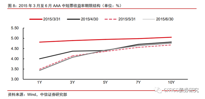 期限利差可以用不同券种计算,本质上体现了利率期限结构。期限利差并非信用债领域特有,在利率研究中同样十分常用,可以用不同期限的国开债收益率之差代表期限利差,其时间序列实际上反映了利率期限结构的变动趋势。例如,2015年3月至6月,AAA信用债的各期限利差均有明显走扩,3Y-1Y、5Y-3Y、10Y-5Y的期限利差分别走高68、28、22bps,体现在期限结构上为牛陡行情。