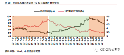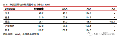 将永续债发行人细分为主要类别,构建中观层面的永续利差。和公募不含权信用债类似,永续债也可以在中观层面构建利差,但由于样本数量较少,我们结合企业性质和主要行业,将永续债在中观层面划分为央企、房企、城投、产业国企和民企。2018年初至今,各类型永续债的品种利差走势逐渐分化,产业国企由于发生了相对较多的延期和递延付息事件,品种利差走扩明显;民企在信用分层的环境下,品种利差同样有所扩大;城投受吉林交投续期风波影响,品种利差在二季度开始走扩。同时,央企和房企的品种利差则保持在低位,主要是因为央企、房企整体的延期、递延付息事件较少。截至2019年3季度末,各行业品种利差由低到高依次为:央企、房企、城投、产业国企、民企。