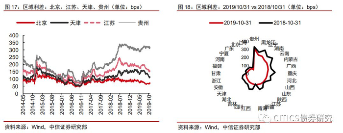 具有实操意义的区域划分则是以更具代表性市区级行政单位为依据。具体到城投债投资的实操,仅细化到省级行政单位的区域利差显得颗粒度较粗,既无法体现江苏省镇江市和苏州市的区别,也无法体现贵州省省级平台和各地级市平台的区别。因此,我们将各省所有城投平台划分为省级平台和各地级市平台,细化区域利差的颗粒度。以贵州为例,2018年下半年开始,省本级平台和各市级平台的利差背道而驰。