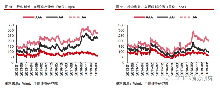 将外部评级纳入考虑,可以细分不同评级的产业债、城投债,并分别构建利差。2018年上半年之前,无论是产业债还是城投债,不同评级之间的利差都比较稳定,而自2018年下半年开始,债市的信用分层现象逐渐凸显,在产业债中主要体现为AAA评级和AA+评级之间的利差分化,在城投债中则主要体现为AA+评级和AA评级之间的利差分化。